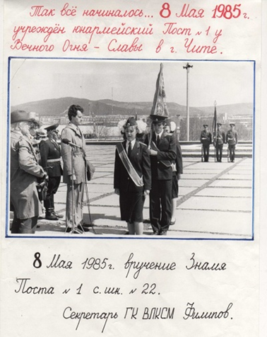 И вот по инициативе командующего войсками ЗабВО, генерала армии Петра Алексеевича Белика, в 1985 году на базе этих отрядов создаётся комсомольско-пионерский «Пост №1». Его руководителем становится Борис Михайлович Семихатов. Он руководил Постом с 1985 по 2001 годы. Борис Михайлович – участник Великой Отечественной войны, награждён орденом Отечественной войны 2-й степени, медалью «За отвагу» и другими боевыми наградами, а также 14-ю юбилейными медалями, медалью «За заслуги перед городом» (Чита, 1998 г.). В 1987 году на Всесоюзном слёте юнармейских постов военно-патриотическая работа Читинского «Поста №1» была признана лучшей.