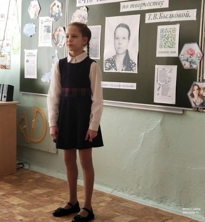 На первой площадке "Литературная гостиная" ученики 4 "Б" класса совместно с классным руководителем Татьяной Олеговной Карлиной и музыкальным руководителем Мариной Камиловной Шамриной представили творчество забайкальской поэтессы Татьяны Владимировны Былковой. Учащиеся декламировали избранные стихотворения поэтессы, а Ирина Бахметьева исполнила песню на стихотворение "Двенадцать лебедей".