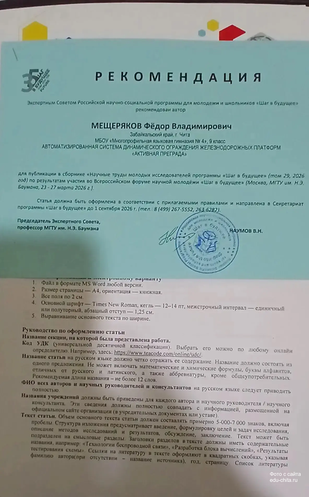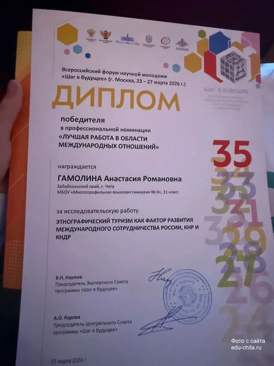 Члены ШНОУ «СИЯР» Многопрофильной языковой гимназии №4 в составе команды «Новаторы» от Забайкальского края приняли участие в 35-м юбилейном Всероссийском форуме научной молодежи «Шаг в будущее», который проходил в г. Москве с 23 по 27 марта.