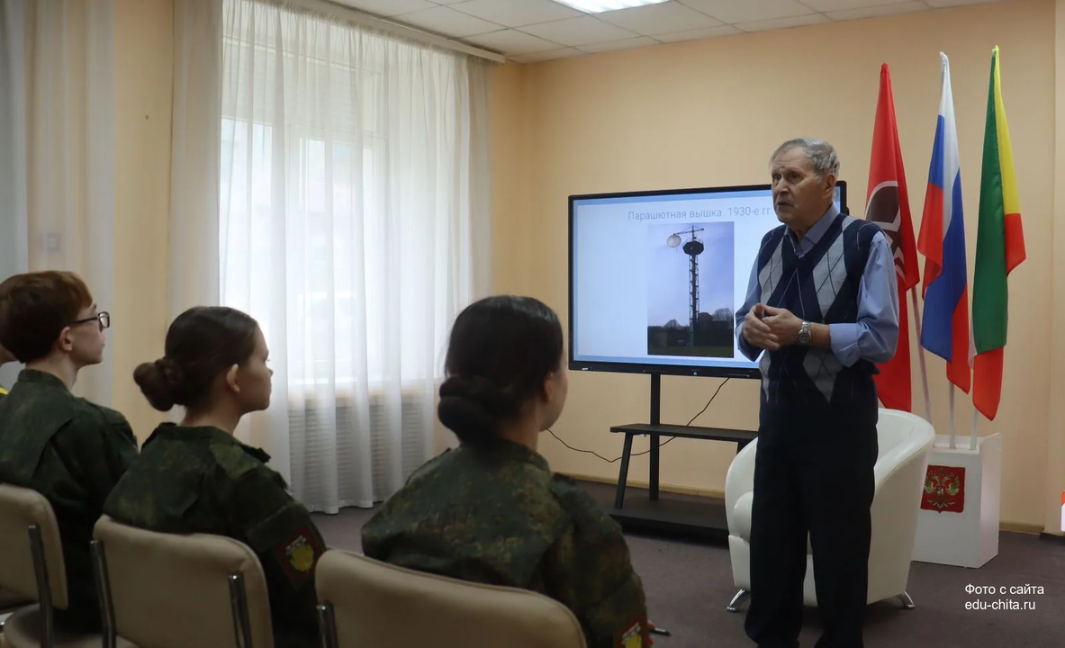 Борис Георгиевич рассказал, что для многих летчиков и космонавтов нашей страны первой ступенькой в небо стали занятия в местных аэроклубах, в том числе и для первого человека в космосе – Юрия Гагарина. Читинский аэроклуб был создан 5 мая 1934 года. Жители нашего города почувствовали на себе дыхание крылатого времени, которое можно было не только ощутить, но и увидеть. Так как в городском саду поднялась парашютная вышка. Здание аэроклуба находилось в то время на перекрёстке улиц Лермонтова и Журавлёва. Здесь решались все организационные вопросы и проводились теоретические занятия с курсантами. А учебные полёты проводились на аэродроме Кадала. Ребятам были показаны уникальные фотографии первых выпусков Читинского аэроклуба.