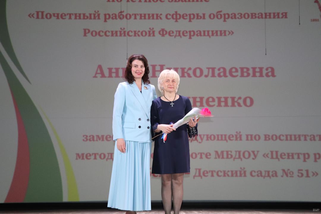 За многолетний добросовестный труд, высокий профессионализм и личный вклад в воспитание подрастающего поколения почётное звание «Почетный работник сферы образования Российской Федерации» присвоено следующим педагогам: воспитателю детского сада №3 Наталье Гулевич, заместителю заведующей детского сада №51 Анне Емельяненко, учителю математики и информатики школы №25 Галине Забеленой, учителю начальных классов школы №30 Светлане Мараткановой, директору школы №40 Светлане Неверовой, учителю китайского языка гимназии №4 Любови Сведловой, учителю русского языка и литературы школы №30 Татьяне Семеновой, учителю истории школы №22 Александре Солонько, учителю истории школы №52 Татьяне Якимовой.