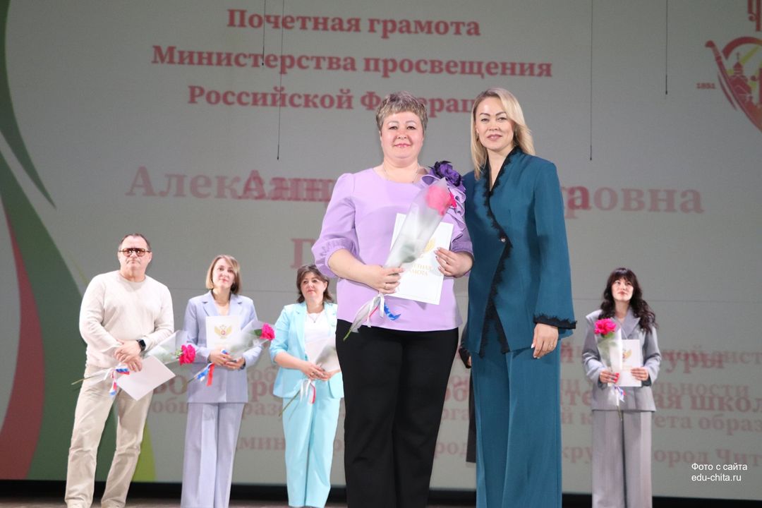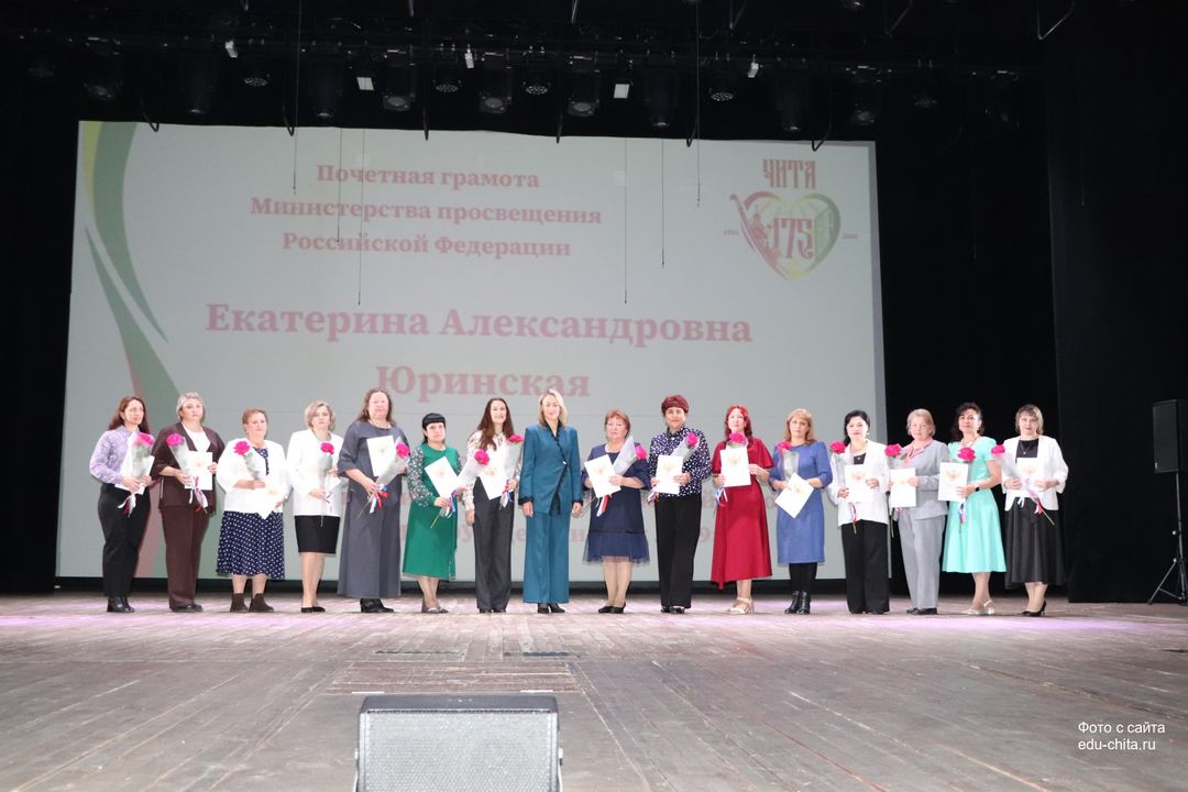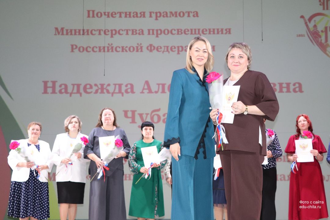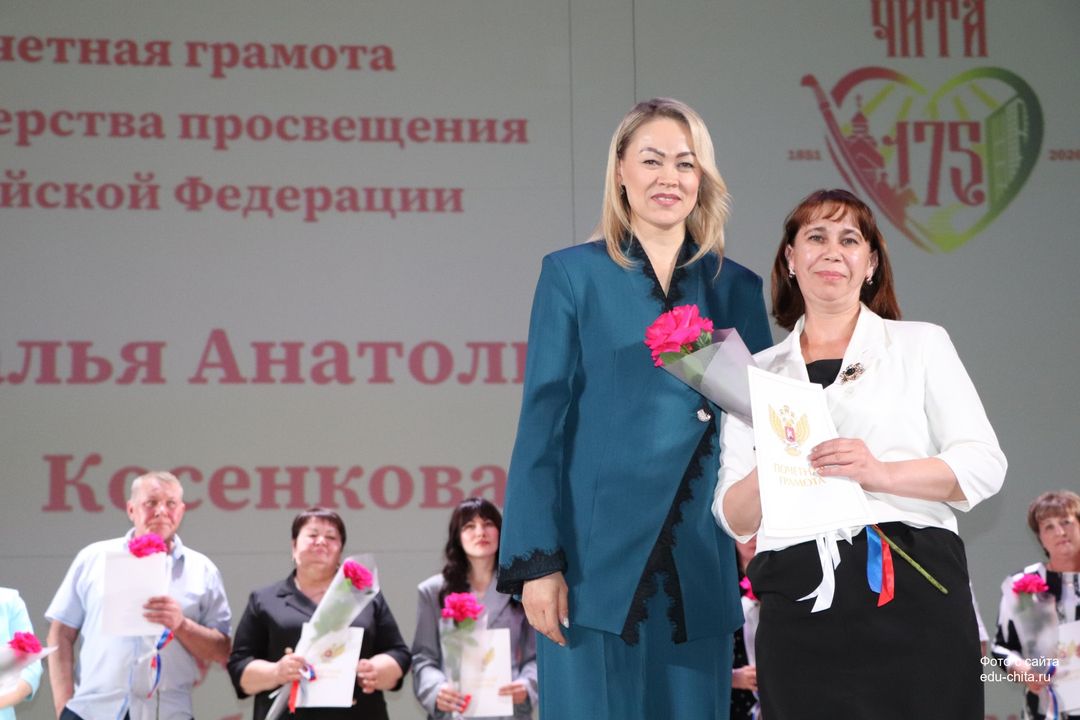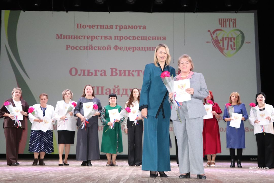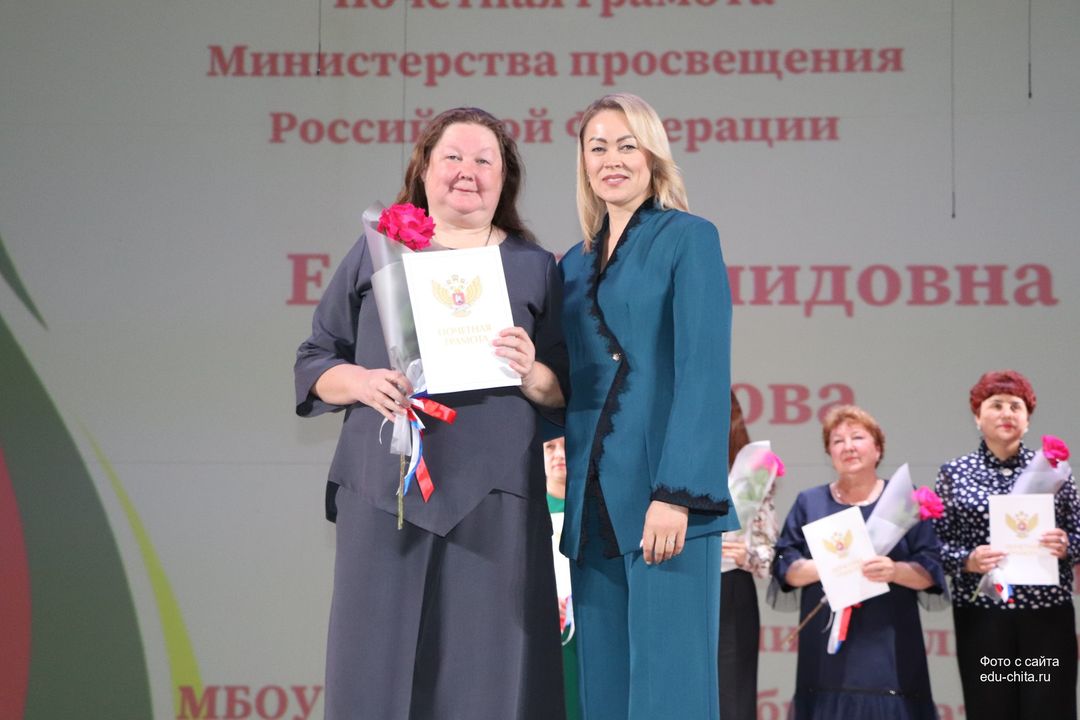 За многолетний добросовестный труд, профессионализм, личный вклад в воспитание и образование подрастающего поколения города Читы, Почетной грамотой Министерства просвещения Российской Федерации отмечены: учитель-дефектолог детского сада №87 Елена Адамова, учитель изобразительного искусства школы №32 Наталья Ахмадулина, воспитатель детского сада №82 Ольга Бахтина, главный специалист отдела ресурсного обеспечения образовательных организаций комитета образования Читы Эдуард Брюхов, заместитель заведующей детского сада №21 Елена Бугаевская, начальник отдела ресурсного обеспечения образовательных организаций комитета образования администрации городского округа «Город Чита» Анастасия Булдыгерова, учитель истории и обществознания школы №11 Виталий Василенко, начальник отдела развития муниципальной системы образования и координации деятельности общеобразовательных организаций комитета образования администрации городского округа «Город Чита» Александра Виттих, учитель физической культуры школы №33 Анна Гаврилова, директор школы №6 Юлия Горбунова, учитель начальных классов школы №26 Елена Градинар, учитель начальных классов школы №45 Наталья Декина, воспитатель детского сада №83 Алена Калугина, учитель-логопед детского сада №81 Елена Клюкина, начальник планово-экономического отдела управления по бухгалтерскому учету, планированию, отчетности и контролю комитета образования Читы Наталья Контанистова, учитель русского языка школы №26 Бэлла Красновская, учитель начальных классов школы №13 Елена Крюкова.