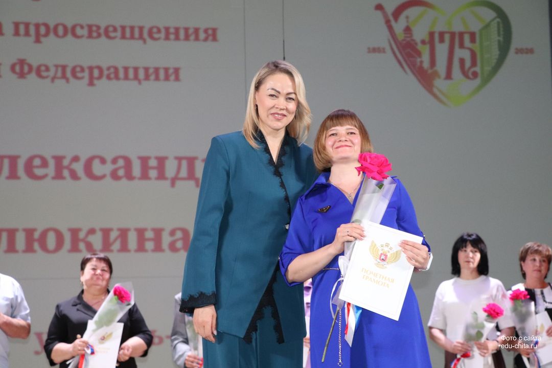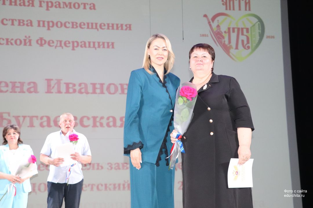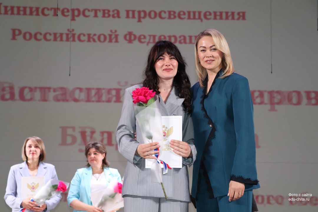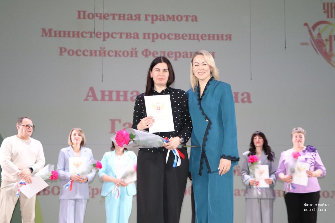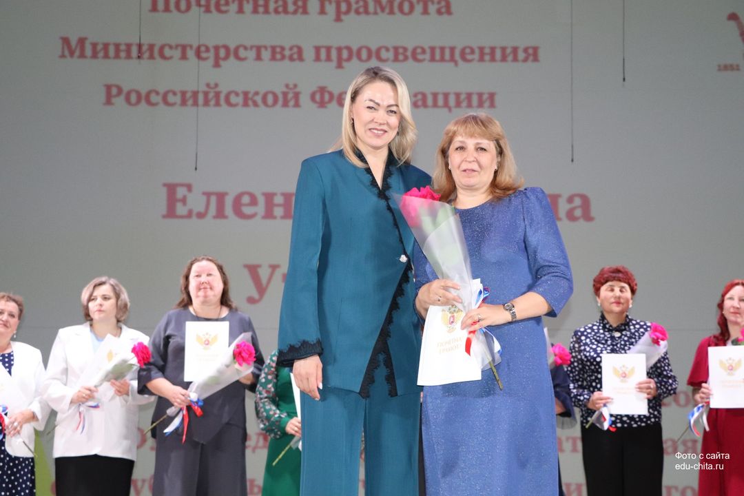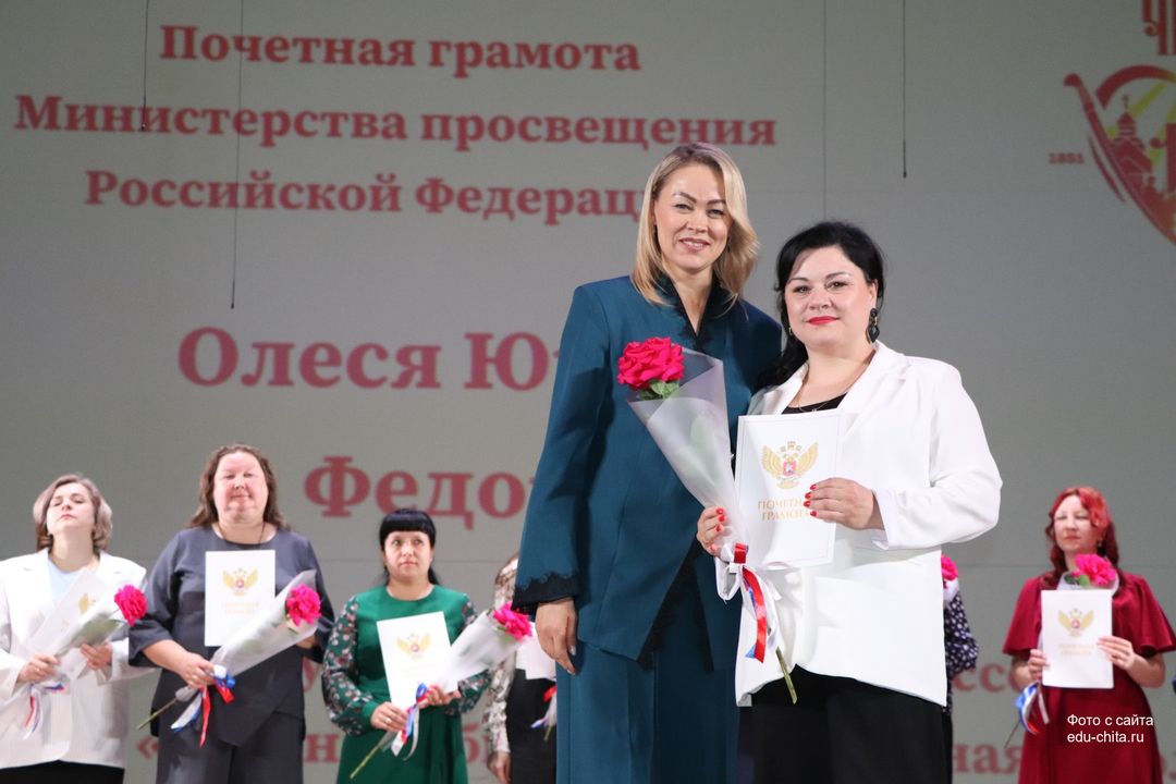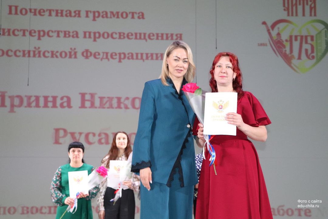 За многолетний добросовестный труд, профессионализм, личный вклад в воспитание и образование подрастающего поколения города Читы, Почетной грамотой Министерства просвещения Российской Федерации отмечены: учитель-дефектолог детского сада №87 Елена Адамова, учитель изобразительного искусства школы №32 Наталья Ахмадулина, воспитатель детского сада №82 Ольга Бахтина, главный специалист отдела ресурсного обеспечения образовательных организаций комитета образования Читы Эдуард Брюхов, заместитель заведующей детского сада №21 Елена Бугаевская, начальник отдела ресурсного обеспечения образовательных организаций комитета образования администрации городского округа «Город Чита» Анастасия Булдыгерова, учитель истории и обществознания школы №11 Виталий Василенко, начальник отдела развития муниципальной системы образования и координации деятельности общеобразовательных организаций комитета образования администрации городского округа «Город Чита» Александра Виттих, учитель физической культуры школы №33 Анна Гаврилова, директор школы №6 Юлия Горбунова, учитель начальных классов школы №26 Елена Градинар, учитель начальных классов школы №45 Наталья Декина, воспитатель детского сада №83 Алена Калугина, учитель-логопед детского сада №81 Елена Клюкина, начальник планово-экономического отдела управления по бухгалтерскому учету, планированию, отчетности и контролю комитета образования Читы Наталья Контанистова, учитель русского языка школы №26 Бэлла Красновская, учитель начальных классов школы №13 Елена Крюкова.