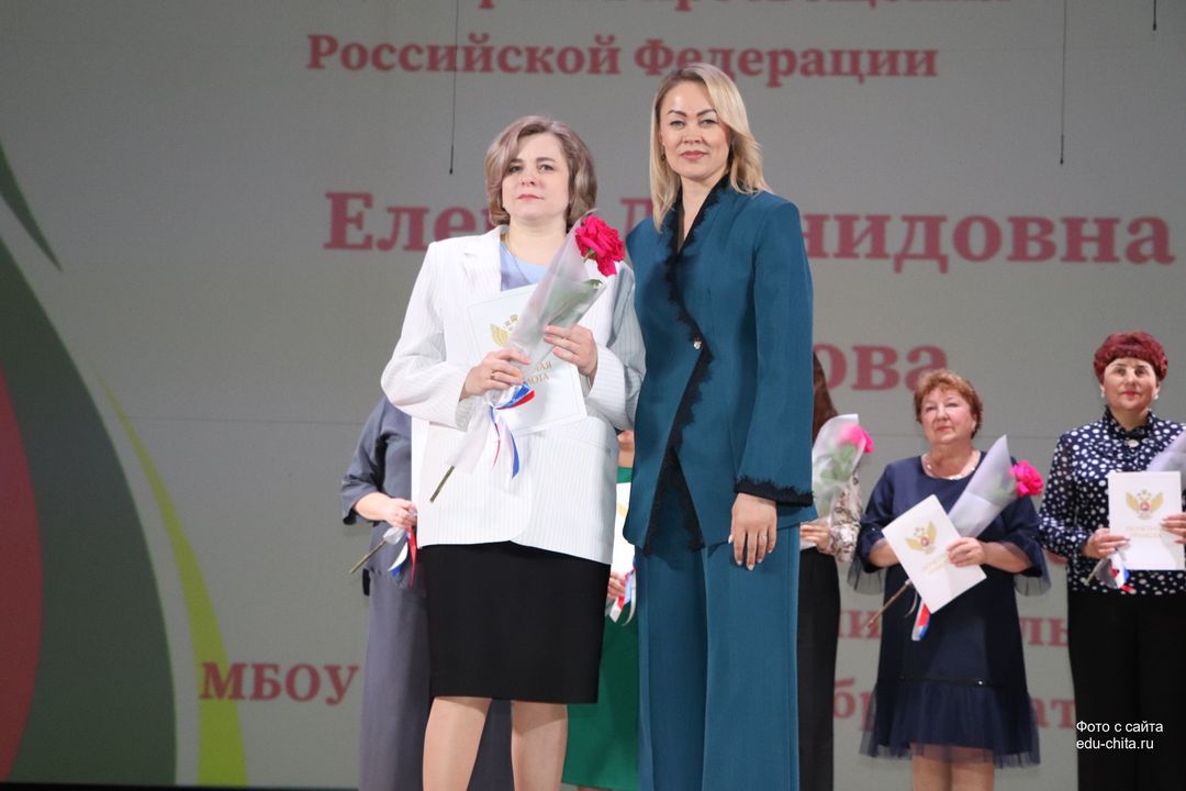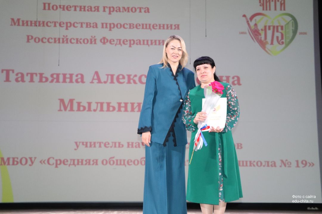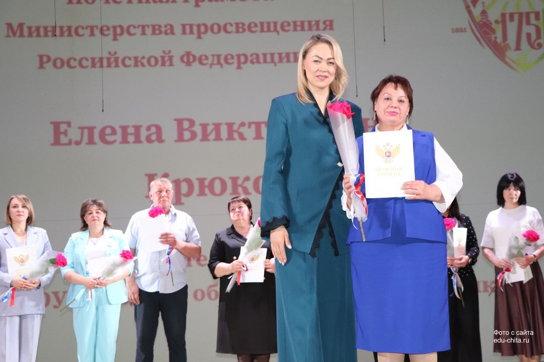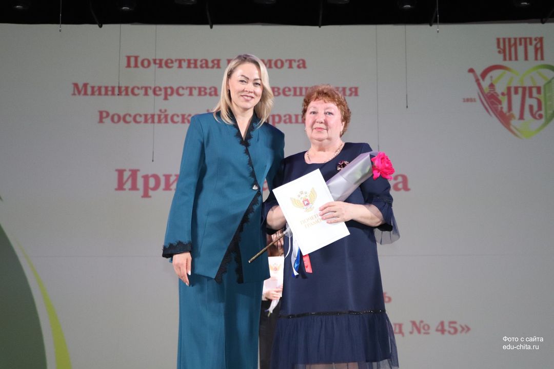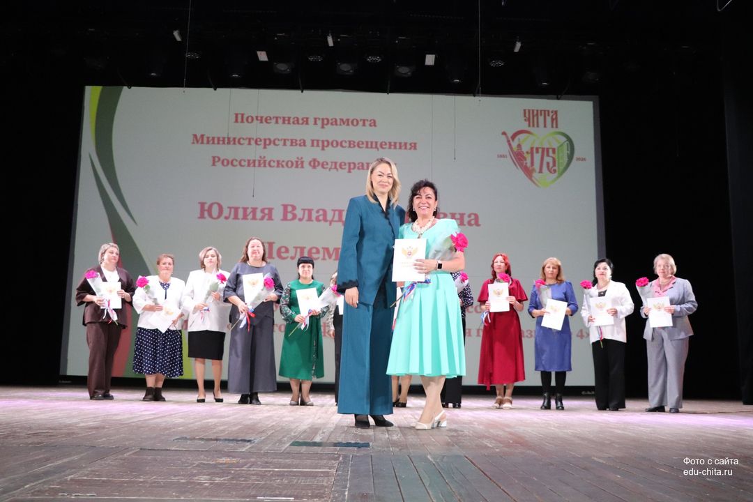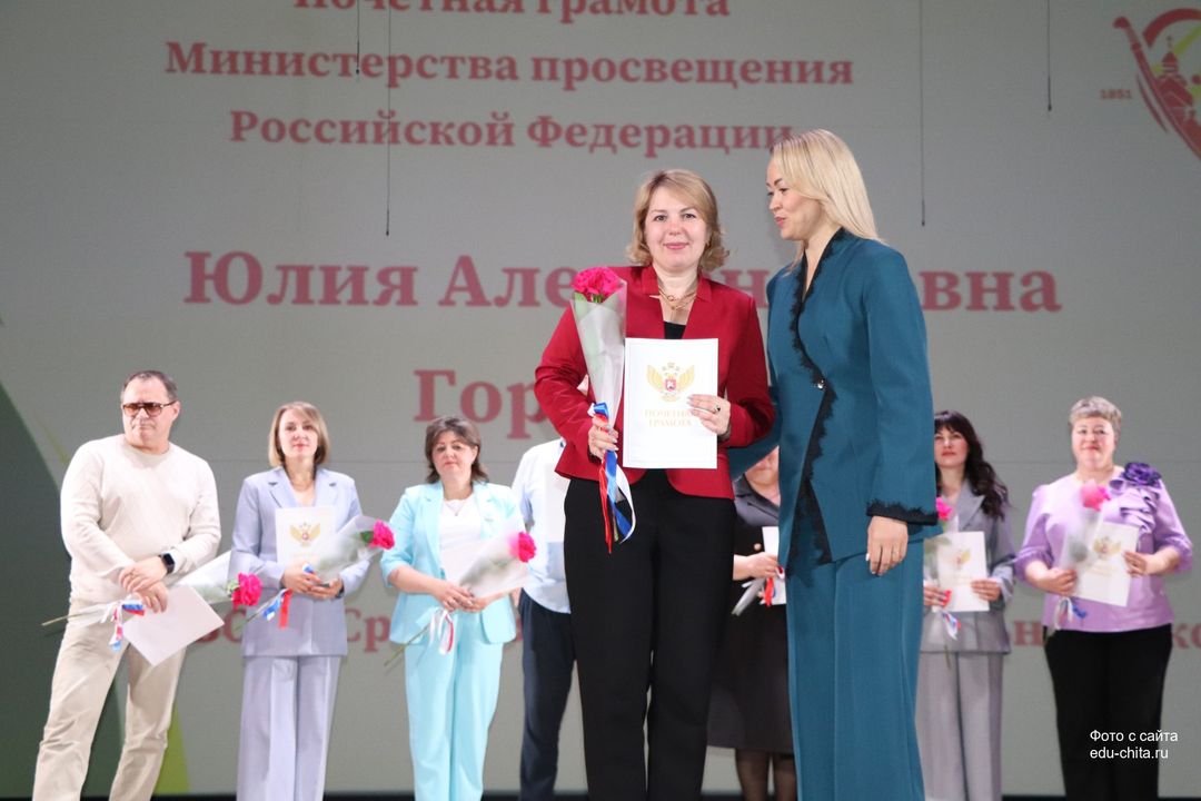За многолетний добросовестный труд, профессионализм, личный вклад в воспитание и образование подрастающего поколения города Читы, Почетной грамотой Министерства просвещения Российской Федерации отмечены: учитель-дефектолог детского сада №87 Елена Адамова, учитель изобразительного искусства школы №32 Наталья Ахмадулина, воспитатель детского сада №82 Ольга Бахтина, главный специалист отдела ресурсного обеспечения образовательных организаций комитета образования Читы Эдуард Брюхов, заместитель заведующей детского сада №21 Елена Бугаевская, начальник отдела ресурсного обеспечения образовательных организаций комитета образования администрации городского округа «Город Чита» Анастасия Булдыгерова, учитель истории и обществознания школы №11 Виталий Василенко, начальник отдела развития муниципальной системы образования и координации деятельности общеобразовательных организаций комитета образования администрации городского округа «Город Чита» Александра Виттих, учитель физической культуры школы №33 Анна Гаврилова, директор школы №6 Юлия Горбунова, учитель начальных классов школы №26 Елена Градинар, учитель начальных классов школы №45 Наталья Декина, воспитатель детского сада №83 Алена Калугина, учитель-логопед детского сада №81 Елена Клюкина, начальник планово-экономического отдела управления по бухгалтерскому учету, планированию, отчетности и контролю комитета образования Читы Наталья Контанистова, учитель русского языка школы №26 Бэлла Красновская, учитель начальных классов школы №13 Елена Крюкова.