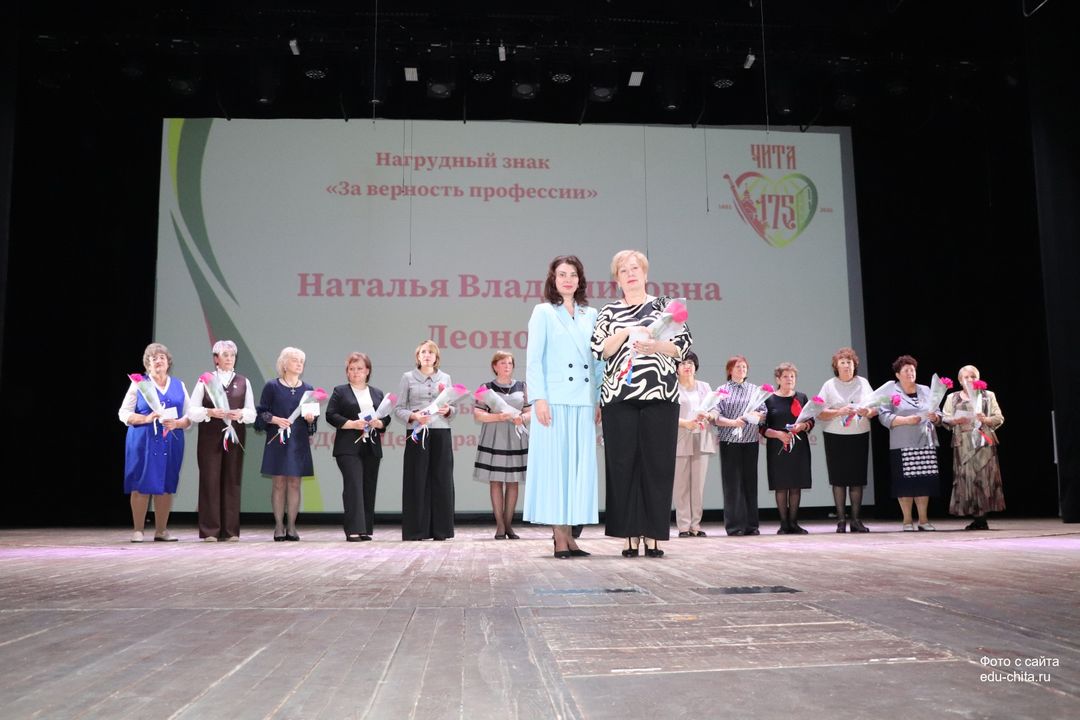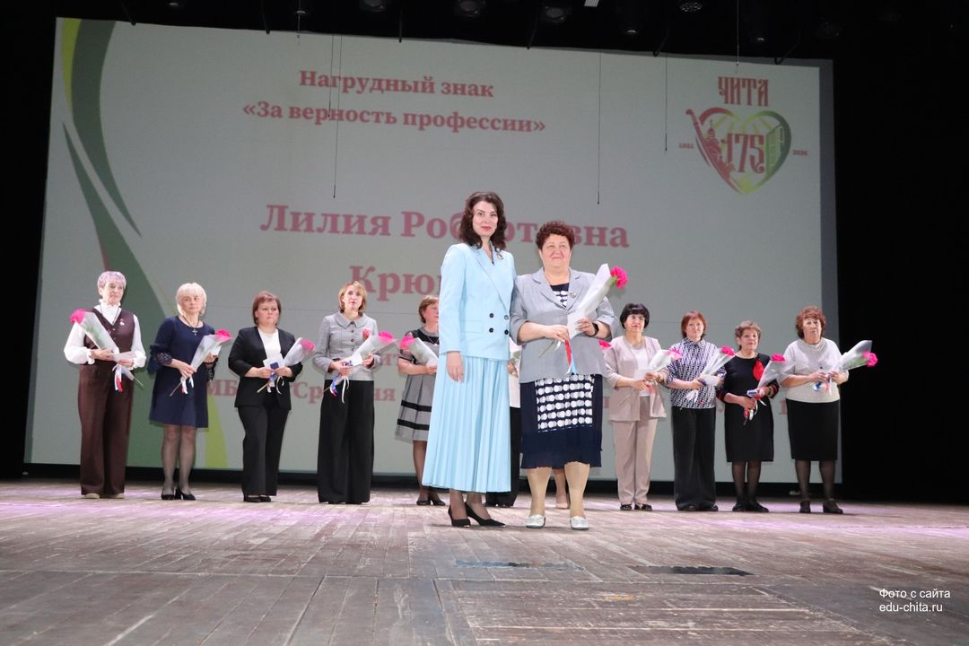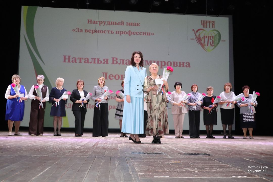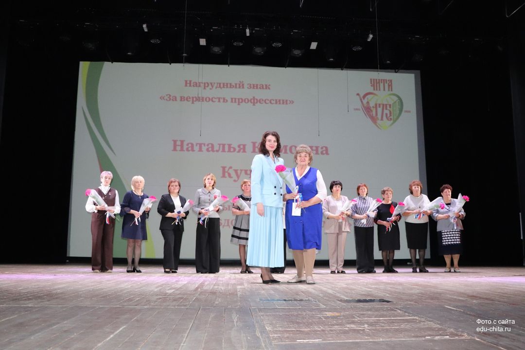 За многолетний добросовестный труд, профессионализм, личный вклад в воспитание и образование подрастающего поколения города Читы нагрудным знаком «За верность профессии» награждены педагог дополнительного образования детского сада № 68 Любовь Засухина, учитель русского языка и литературы школы №38 Альфия Золотухина, учитель математики гимназии №4 Тамара Иванова, учитель начальных классов школы №13 Лилия Крюкова, музыкальный руководитель детского сада № 74 Наталья Кучер, музыкальный руководитель детского сада №71 Наталья Леонова, учитель начальных классов школы №7 Людмила Шегаева.