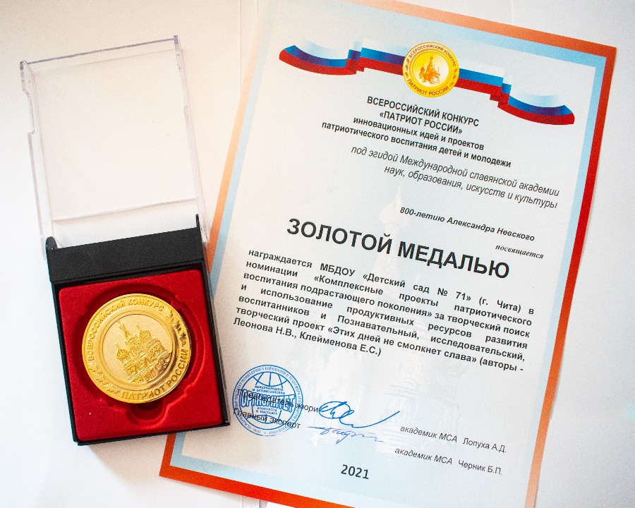 МБДОУ «Детский сад №71» награждён золотой медалью за участие в конкурсе «Патриот России» в номинации «Комплексные проекты патриотического воспитания подрастающего поколения». Сотрудники ДОУ заочно представляли на конкурс проект – «Этих дней не смолкнет слава»