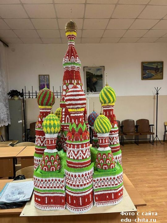 Ученица 11 «а» класса школы №22 города Читы Ольга Руписова создала из бумаги ручной макет памятника русской архитектуры – Храм Василия Блаженного, который расположен на главной площади страны.