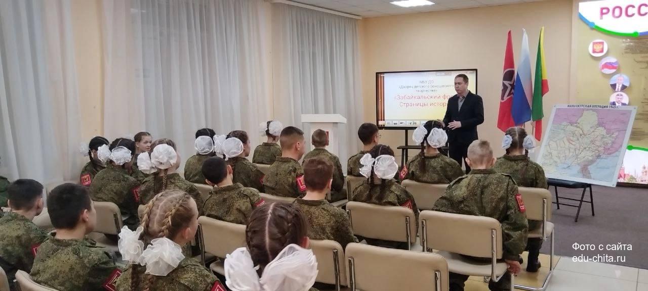В рамках проекта «Забайкальский фронт. Страницы истории» Денис Жеребцов поделился с ребятами информацией о значении и итогах Советско-Японской войны 1945 года как о завершающем этапе Второй мировой войны. Завершили занятия культурные испытания в формате интеллектуальной викторины, где юнармейцы отвечали на вопросы, посвященные важнейшим историческим событиям и выдающимся военным деятелям.