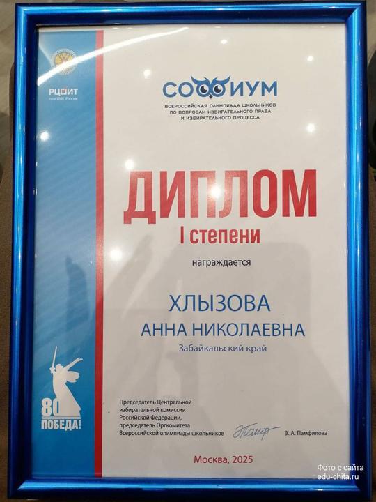 Анна одержала победу в финальных испытаниях Всероссийской олимпиады школьников по избирательному праву и избирательному процессу "Софиум", набрав 13,5 баллов из 15 возможных.