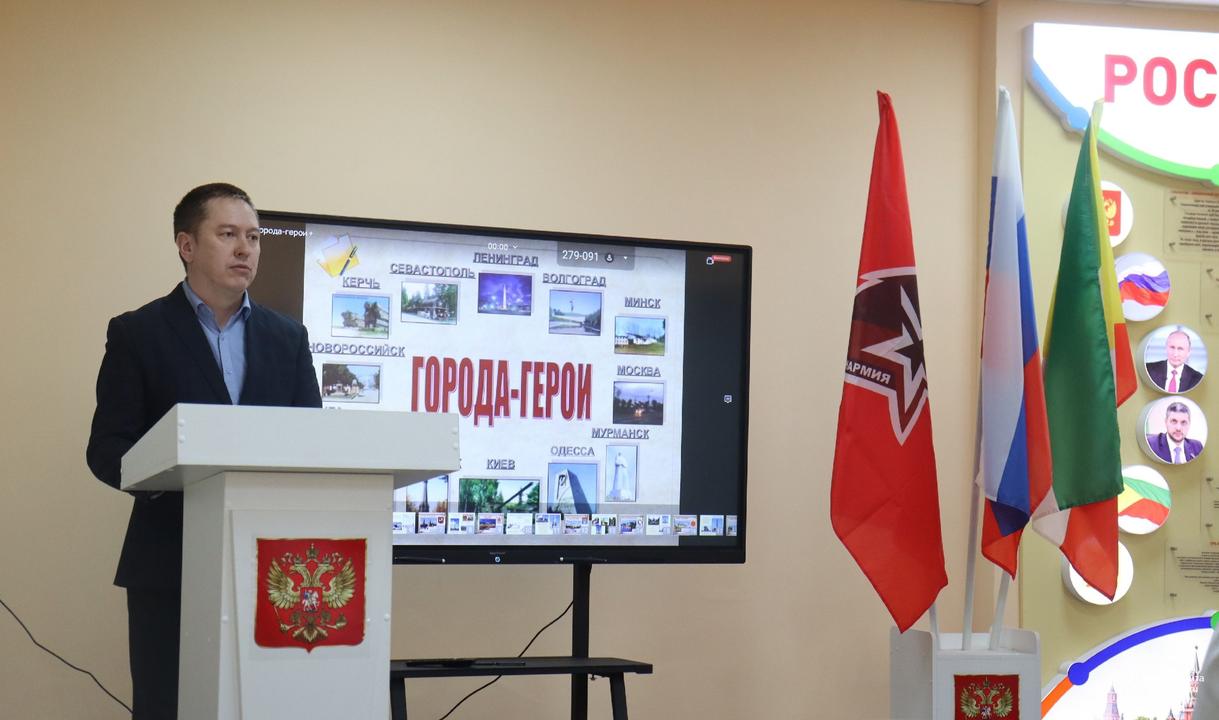 Педагог Денис Жеребцов рассказал ребятам о городах, которым за их вклад в победу было присвоено высокое звание «Города-герои». Ребята узнали, что первыми городами-героями стали Ленинград (с 1991 года – Санкт-Петербург), Волгоград (до 1961 года — Сталинград), Москва, Севастополь, Одесса и Киев. Позднее это звание получили ещё шесть городов – Керчь, Минск, Новороссийск, Тула, Мурманск и Смоленск. Также высокое звание «Крепость-герой» получил Брест, сейчас это мемориальный комплекс и одна из главных достопримечательностей Белоруссии. Защитники этих городов в ходе ожесточенных сражений проявили мужество, стойкость и отвагу.