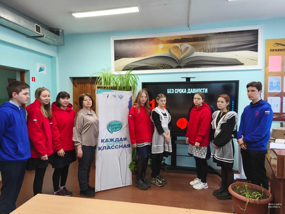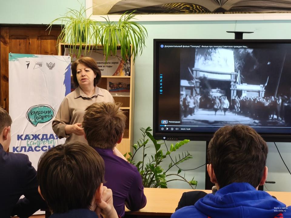 Старшеклассники, ученики 9-11 классов, приняли участие в «Классной встрече» с учителем истории Мариной Львовной Пиксайкиной. После просмотра документального фильма о трагической судьбе мирного населения в военные годы, ребята обсудили важность сохранения исторической памяти о тех страшных событиях.