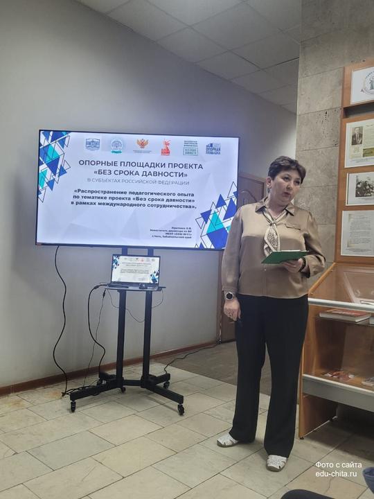 В рамках образовательной сессии «Обмен педагогическими практиками по реализации образовательно-просветительских мероприятий проекта «Без срока давности» Ольга Викторовна Нуштаева представила опыт реализации проекта в рамках международного сотрудничества.