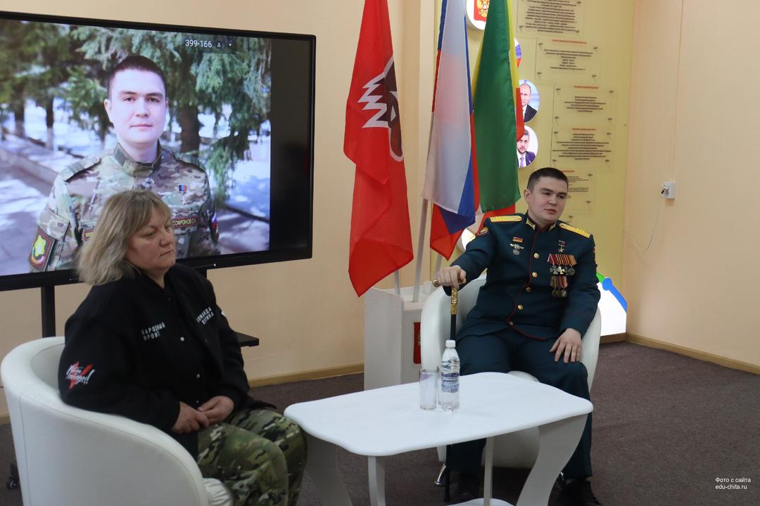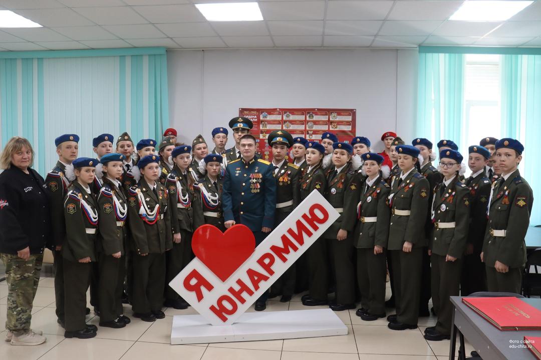 Сегодня в Центре героико-патриотического воспитания «Доме юнармии» Почетный караул школы №24 встретился с участником Специальной военной операции, Героем Донецкой Народной Республики (ДНР) и Героем России Семеном Софроновым и представителем «Народного фронта», волонтером СВО Светланой «Счастье» Изумрудовой.