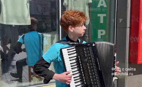 Песни Великой Победы звучат на улицах краевой столицы! Читинцы в минувшее воскресенье могли услышать знакомые мелодии на аккордеоне в исполнении 16-летнего Ивана. Юноша признаётся, что взял в руки инструмент, потому что другого не было — хотел гитару. А затем в него влюбился. Решил выйти на улицу не ради заработка, а просто на радость горожанам.