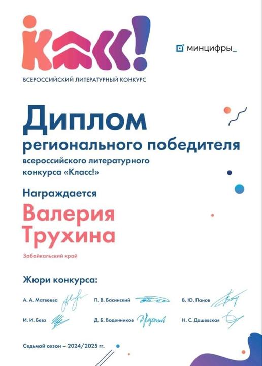 Поздравляем с блестящей победой Валерию Трухину и её творческого вдохновителя — учителя русского языка и литературы Елену Станиславовну Завьялову! Достижение юной писательницы стало настоящим прорывом для Забайкальского края в области детского литературного творчества.