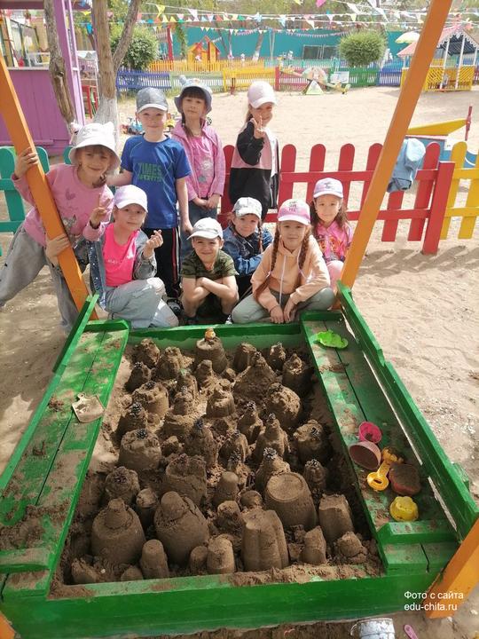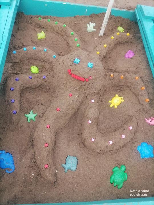В детском саду №68 состоялся конкурс «Песочные фантазии». Дети и воспитатели строили фигуры из песка и украшали их.
