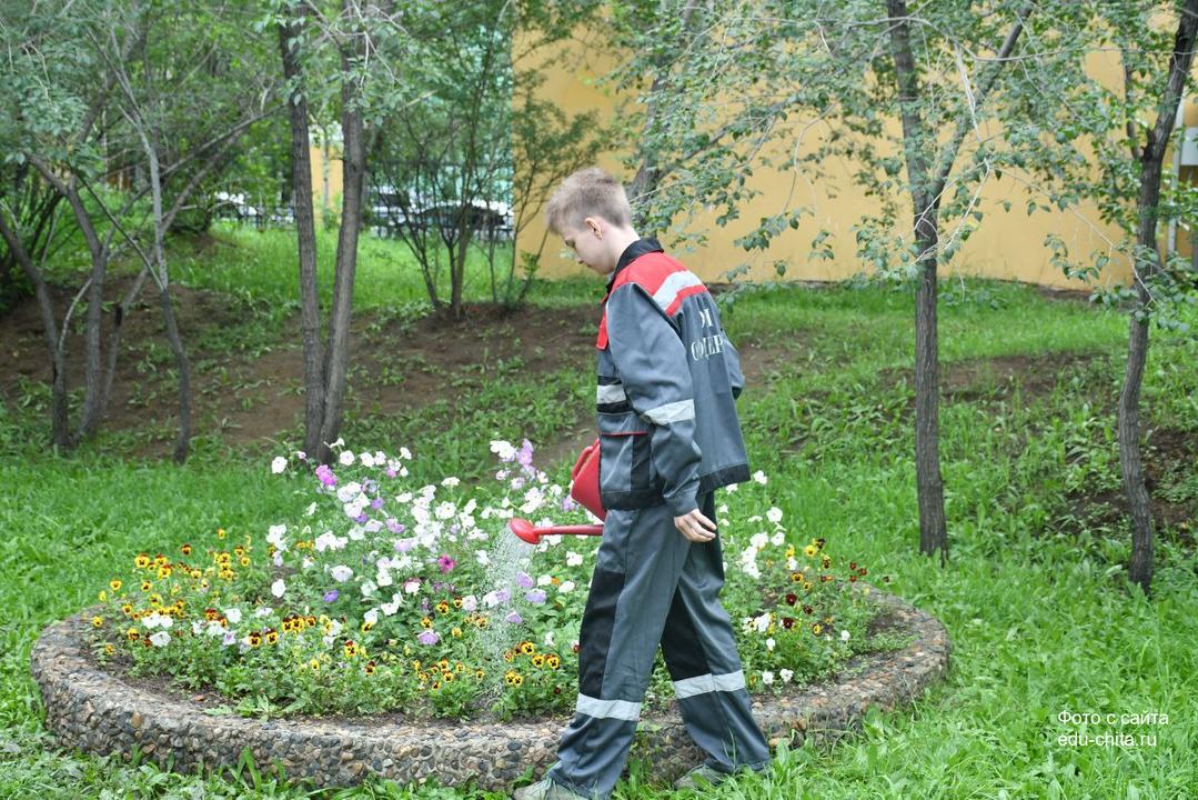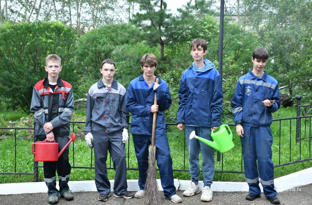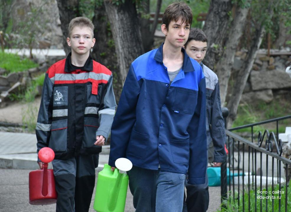 Пятеро юношей этим летом трудоустроены в Дом офицеров Забайкальского края на должности разнорабочих. Их трудовой день начинается в 8 часов и заканчивается в 11.30. Предусмотрена сокращённая рабочая неделя. Все обеспечены специальной одеждой, инвентарем.