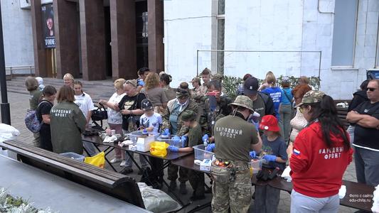 На несколько часов сегодня крыльцо краевой филармонии превратилось в площадку добрых дел. Взрослые и дети плели маскировочные сети и осваивали навыки тактической медицины. Это мероприятие «Народного фронта» прошло в рамках Всероссийской акции памяти Николая Ковалёва и Давида Соколова - волонтёров, погибших в Курской области. Подробности у Виктории Викторовой.