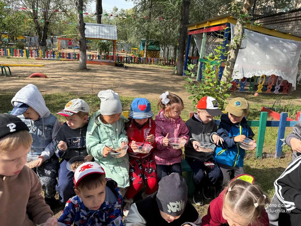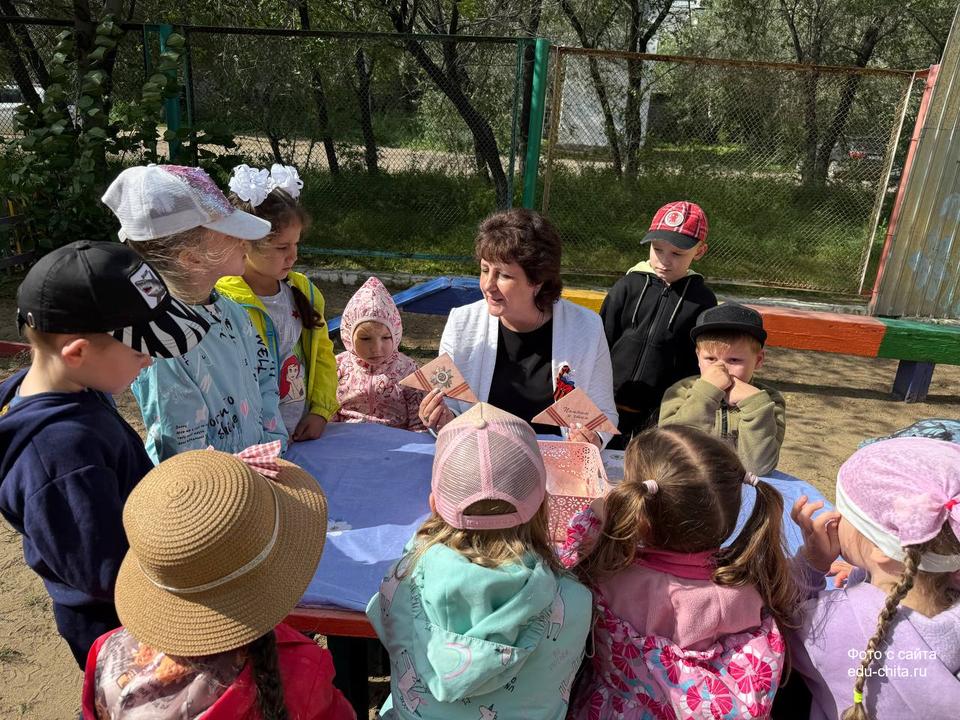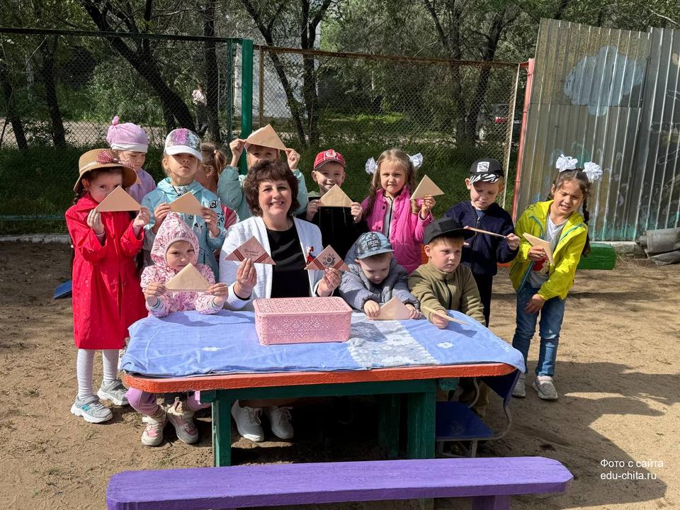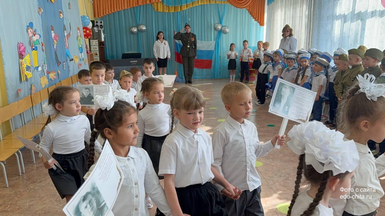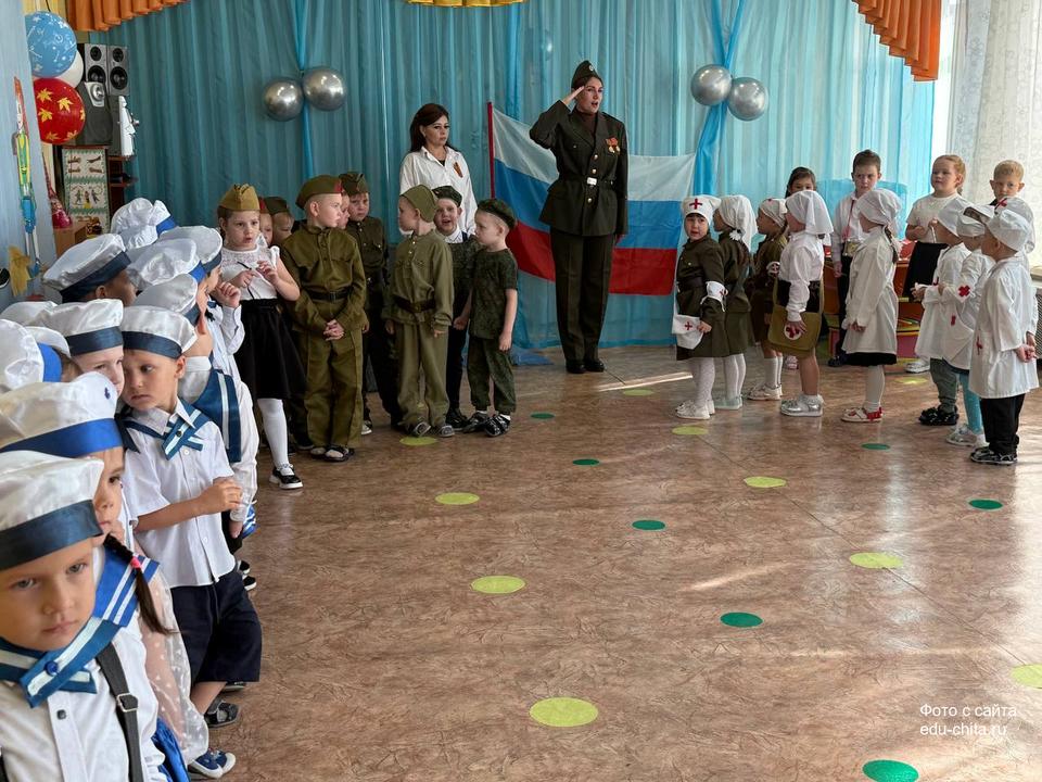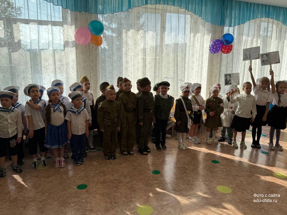 Ко Дню окончания Второй Мировой войны в детском саду №62 города Читы прошел Парад Победы. Воспитанники дошкольного учреждения приняли участие в праздничных мероприятиях. Стройными колоннами выстроились ряды юных «солдат», «медсестер» и «моряков». Следом прошла колонна «Бессмертного полка», несущая портреты ветеранов Великой Отечественной войны. Торжественное построение возглавил «главнокомандующий» детского сада.