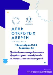Познакомьтесь с IT-Кубом поближе! Вы сможете сами посмотреть наши кабинеты, узнать о наших направлениях, а самые любознательные смогут попробовать себя в роли нашего ученика и посетить увлекательные мастер классы!