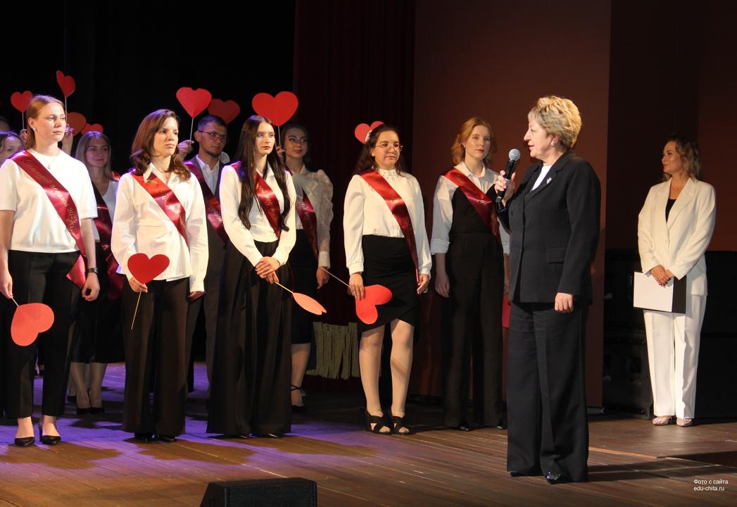 Продолжением торжественной церемонии стало выступление молодых педагогов, которые, держа в руках символические сердца, подчеркнули, что они готовы отдать частичку своей души ученикам. Председатель комитета образования Читы Оксана Кирик поздравила начинающих педагогов с первым профессиональным праздником и вручила им символичные памятные подарки.