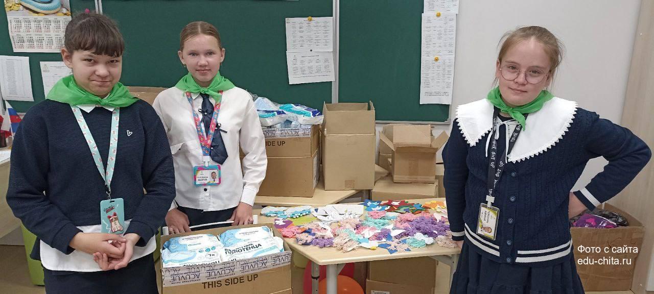 Вожатые школы №55 Наталья Николаевна Клочко и Татьяна Георгиевна Денисова организовали в школе акцию помощи участникам специальной военной операции. Они объединили усилия детских объединений «Импульс» и «Робби».