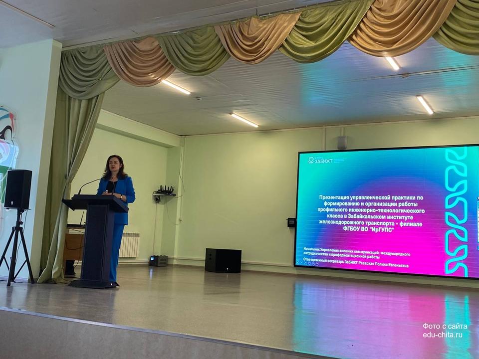 Директор школы №40 Светлана Неверова представила опыт своего образовательного учреждения в организации работы профильного инженерно-технического класса. В ее выступлении также были затронуты вопросы сетевого взаимодействия школы с Забайкальским институтом железнодорожного транспорта и детским садом №87.