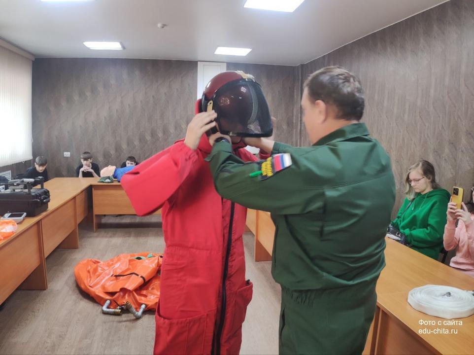 В ходе посещения учебного класса Читинского авиаотделения, ребята с удовольствием примерили на себя костюм пожарного-парашютиста, почувствовали вес парашюта, одели защитный шлем.
