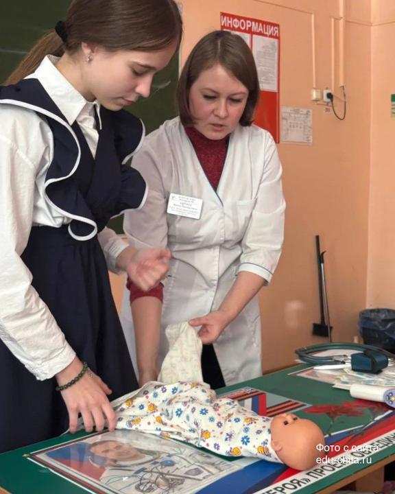 Самой увлекательной стала практическая часть. Школьники попробовали себя в роли врачей: осматривали манекен новорожденного, измеряли температуру, сатурацию и артериальное давление, проводили аускультацию, учились пеленать и оценивать состояние малыша. Каждый смог почувствовать ответственность и важность медицинской работы.