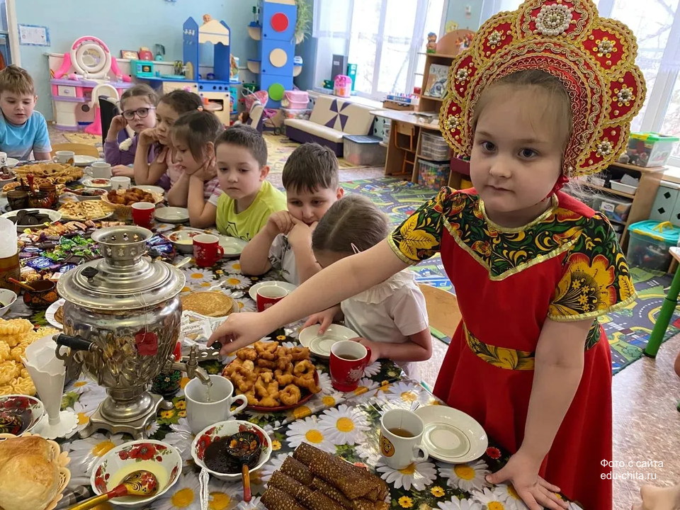 В ДОУ № 74 воспитанники подготовительных групп сегодня устроили «пир на весь мир» с явствами и блинами. Пели песни, играли в игры, водили хоровод.